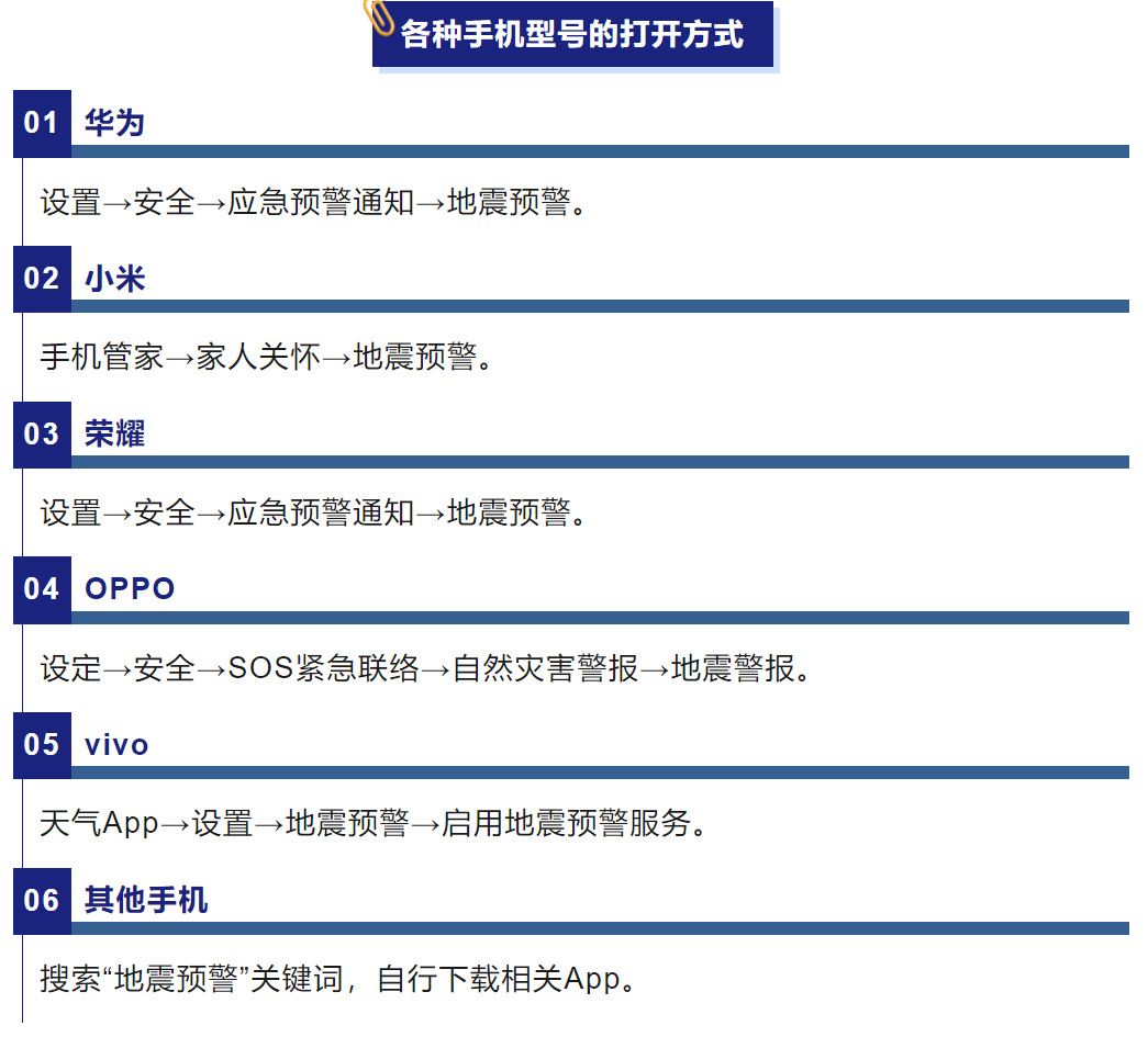部分品牌手机需要到系统“设置”当中,找到“安全”选项,然后根据提示打开“地震预警”功能;其他品牌手机需要到应用商店中,搜索“地震预警”关键词,自行下载相关APP。