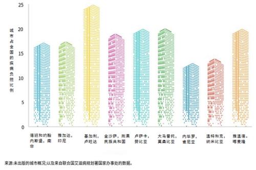 艾滋病对全球社会经济造成了巨大的负担。许多城市的艾滋病负担很高,在“快速通道城市项目”第一年纳入的城市中,各城市的艾滋病负担在全国所占比例如下图所示。卢旺达所有感染者中有四分之一生活在基加利,仅一个城市就承担了高达25%的国家艾滋病负担。虽然雅加达人口仅占印度尼西亚总人口的4%,但该市却占全国艾滋病负担的17%。