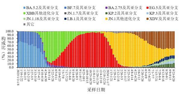 2024年9月1日-9月30日,全国31个省(自治区、直辖市)及新疆生产建设兵团共报送10777例本土病例新冠病毒基因组有效序列,均为奥密克戎变异株。主要流行株为JN.1系列变异株和XDV系列变异株。根据采样日期,近4周JN.1及其亚分支(包括JN.1.7、KP.2、KP.3、JN.1.18、LB.1及其亚分支以及JN.1其他进化分支)占比分别为51.7%、53.2%、51.1%、52.5%,XDV及亚分支占比分别为47.9%、46.6%、48.6%、47.2%。见图4。
