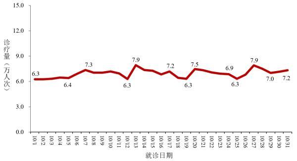 2024年10月1日-10月31日,全国31个省(自治区、直辖市)及新疆生产建设兵团发热门诊(诊室)诊疗量在6.3万至7.9万之间波动。见图2。