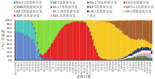 2024年10月1日-10月31日,全国31个省(自治区、直辖市)及新疆生产建设兵团共报送4545例本土病例新冠病毒基因组有效序列,均为奥密克戎变异株。主要流行株为XDV系列变异株和JN.1系列变异株。根据采样日期,第40周(9月30日-10月6日)至第44周(10月28日-11月3日)JN.1及亚分支(包括JN.1.7、KP.2、KP.3、JN.1.18、LB.1、KP.3.1.1及亚分支以及JN.1其他进化分支)占比分别为48.3%、47.3%、44.4%、41.3%、41.7%,XDV及亚分支占比分别为50.5%、51.0%、55.1%、56.9%、58.3%。见图4。
