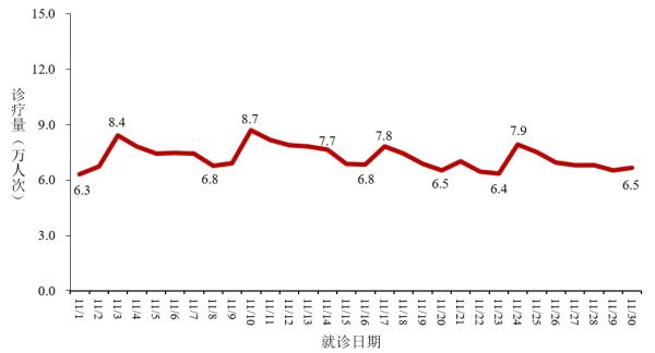 2024年11月1日-11月30日,全国31个省(自治区、直辖市)及新疆生产建设兵团发热门诊(诊室)诊疗量在6.3万至8.7万之间波动。见图2。