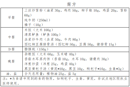 以下食谱适合轻体力活动的成人糖尿病患者,一天食谱的能量在1600~2000kcal范围,使用者可结合自身活动量及其他因素合理调整能量。食谱设计保持食物多样,尽量选择低GI食物、食药物质和中医食养方。全天限量烹调油25g,盐5g。