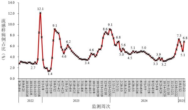 2025年第1周(2024年12月30日-2025年1月5日)至第5周(1月27日-2月2日),全国哨点医院流感样病例占门(急)诊就诊人数比例在5.1%-7.3%之间,流感样病例占比分别为7.3%、6.7%、6.0%、5.1%和6.8%。见图4-1。
