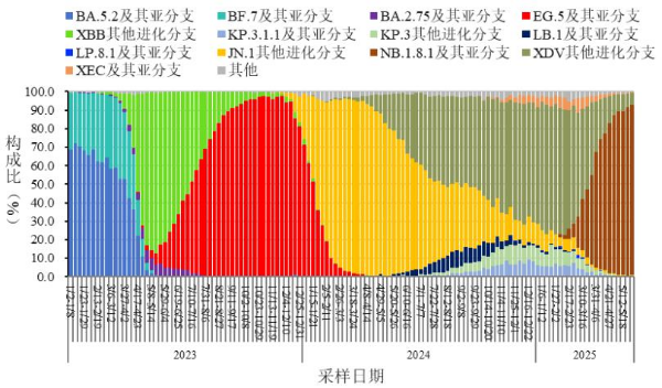 2025年5月1日-5月31日,全国31个省(自治区、直辖市)及新疆生产建设兵团共报送12275例本土病例新冠病毒基因组有效序列,均为奥密克戎变异株。主要流行株为NB.1.8.1(XDV变异株第六代亚分支)。根据采样日期,第19周(5月5日-5月11日)至第22周(5月26日-6月1日)NB.1.8.1占比分别为85.3%、88.4%、92.1%、91.9%。见图5。