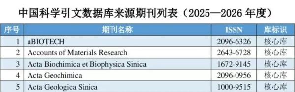 CSCD创建于1989年,是我国唯一一个与科睿唯安、爱思唯尔合作的引文数据库,也是目前国内最权威的自然科学、工程技术和医药卫生等领域文献检索与评价工具之一。CSCD采用定量统计、专家评审相结合的方法,原则上每两年对来源期刊目录进行一次遴选,遴选范围包括数学、物理学、化学、地球科学、生物科学、农业科学、医药卫生、工程技术、环境科学、交叉学科等学科领域的期刊。2025—2026年度CSCD收录来源期刊1464种,其中中国出版的英文期刊418种,中文期刊1046种。CSCD来源期刊分为核心库和扩展库两部分,其中核心库1098种,扩展库366种。CSCD凭借严格的期刊遴选标准、规范的引文数据加工以及强大的分析评估能力,在科研业绩考核、成果申报、人才选拔、项目评估等诸多领域发挥着显著的作用。