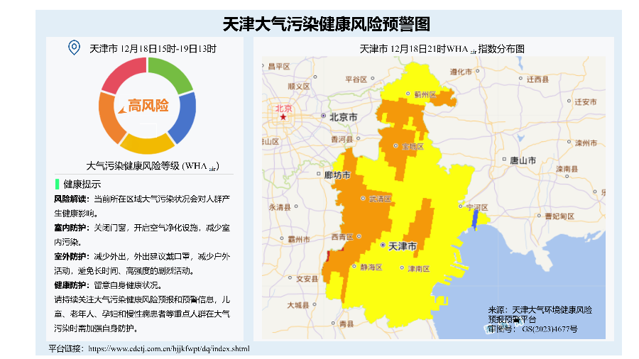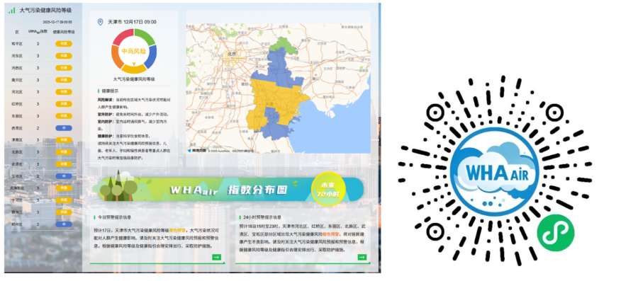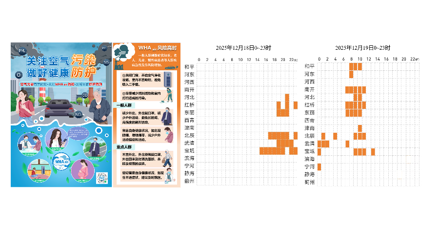 请公众及时关注预警信息变化。登陆天津大气环境健康风险预报预警平台获取详细预警信息,//m.teddywedding.com/hjjkfwpt/dq/index.shtml。使用大气环境健康风险预报(WHAair指数)小程序获取大气环境健康风险预警实时信息。