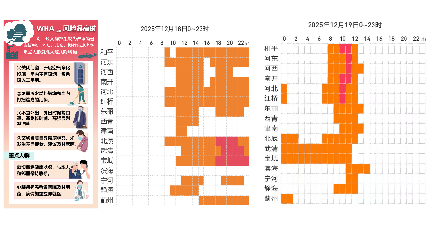 天津市疾病预防控制中心2025年12月18日升级大气污染健康风险预警:预计18日18时至22时北辰区、武清区和宝坻区,19日10时至11时和平区、河东区、河西区、南开区、河北区、红桥区等多区大气污染进一步加重,大气污染健康风险很高(红色预警),请当地居民加强防范。在18日18时至19日11时风险时间段,室内关闭门窗,开启空气净化设施,不宜吸烟,减少室内燃料燃烧和打扫;不宜外出,如需外出,请佩戴口罩;避免长时间或高强度剧烈活动,密切留意自身健康状况。老人、孕妇、儿童、慢性病患者加强关注自身健康状况,如不适及时就医。