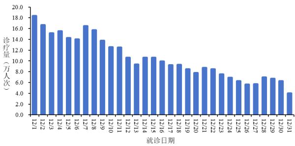 2025年12月1日-12月31日,全国31个省(自治区、直辖市)及新疆生产建设兵团各级各类医疗机构发热门诊(诊室)诊疗量,从12月1日的18.3万人次波动下降至12月31日的4.0万人次。见图1。