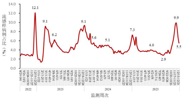 2025年第49周(12月1日-12月7日)至第52周(12月22日-12月28日),全国哨点医院流感样病例占门(急)诊就诊人数比例呈下降趋势,分别为9.9%、8.6%、6.7%、5.5%。见图4-1。